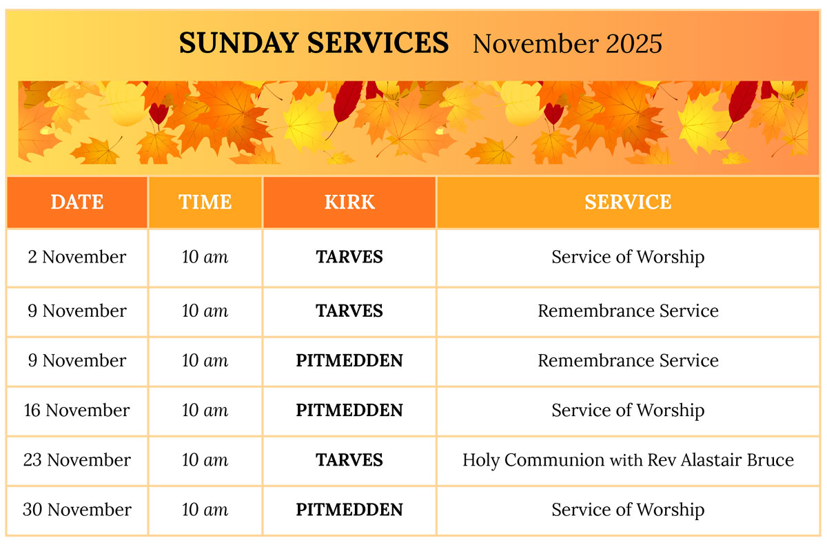 Services of worship are held on Sundays at 10.00 am alternating between Tarves and Pitmedden kirks. Check the calendar for details.