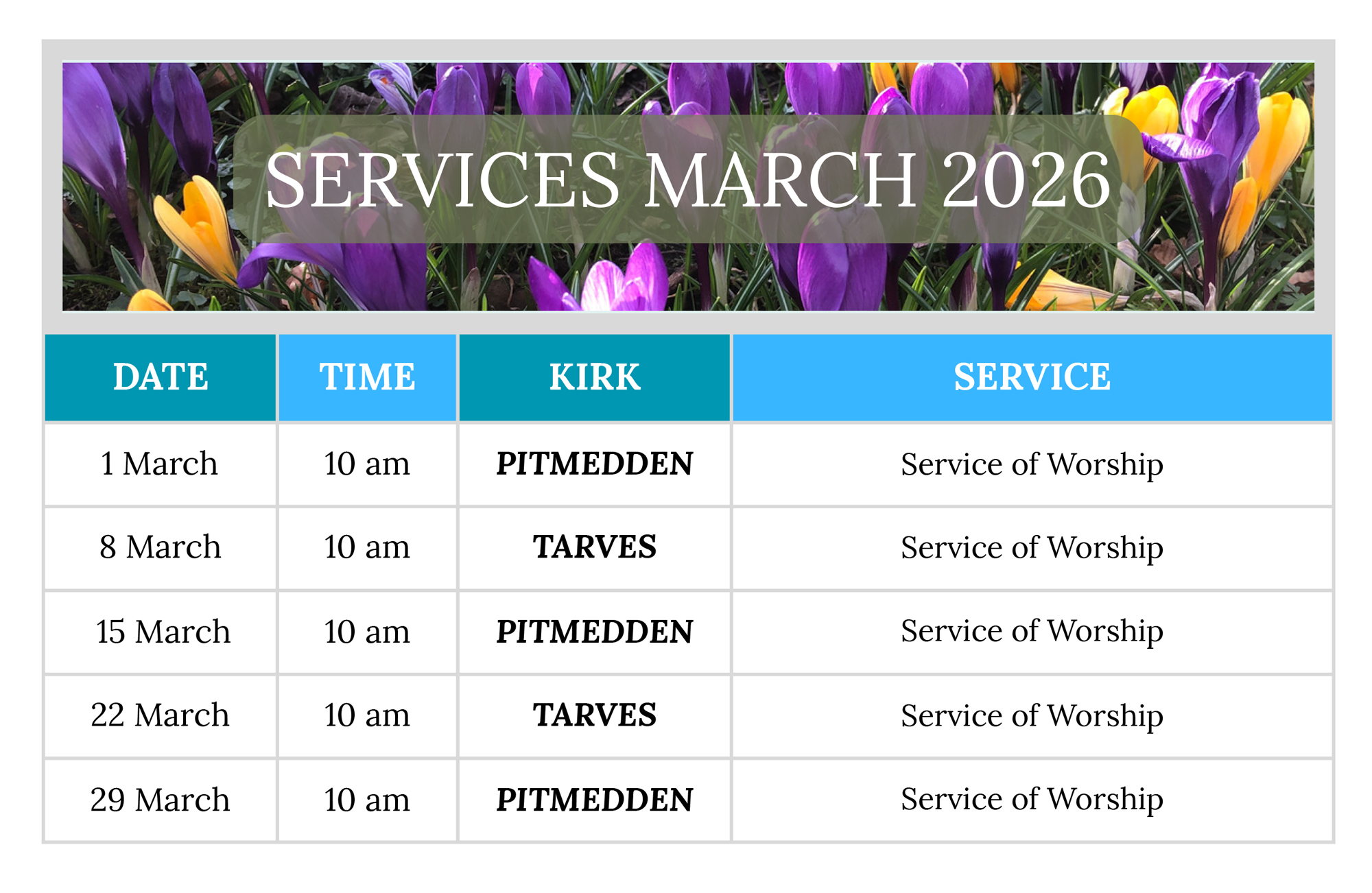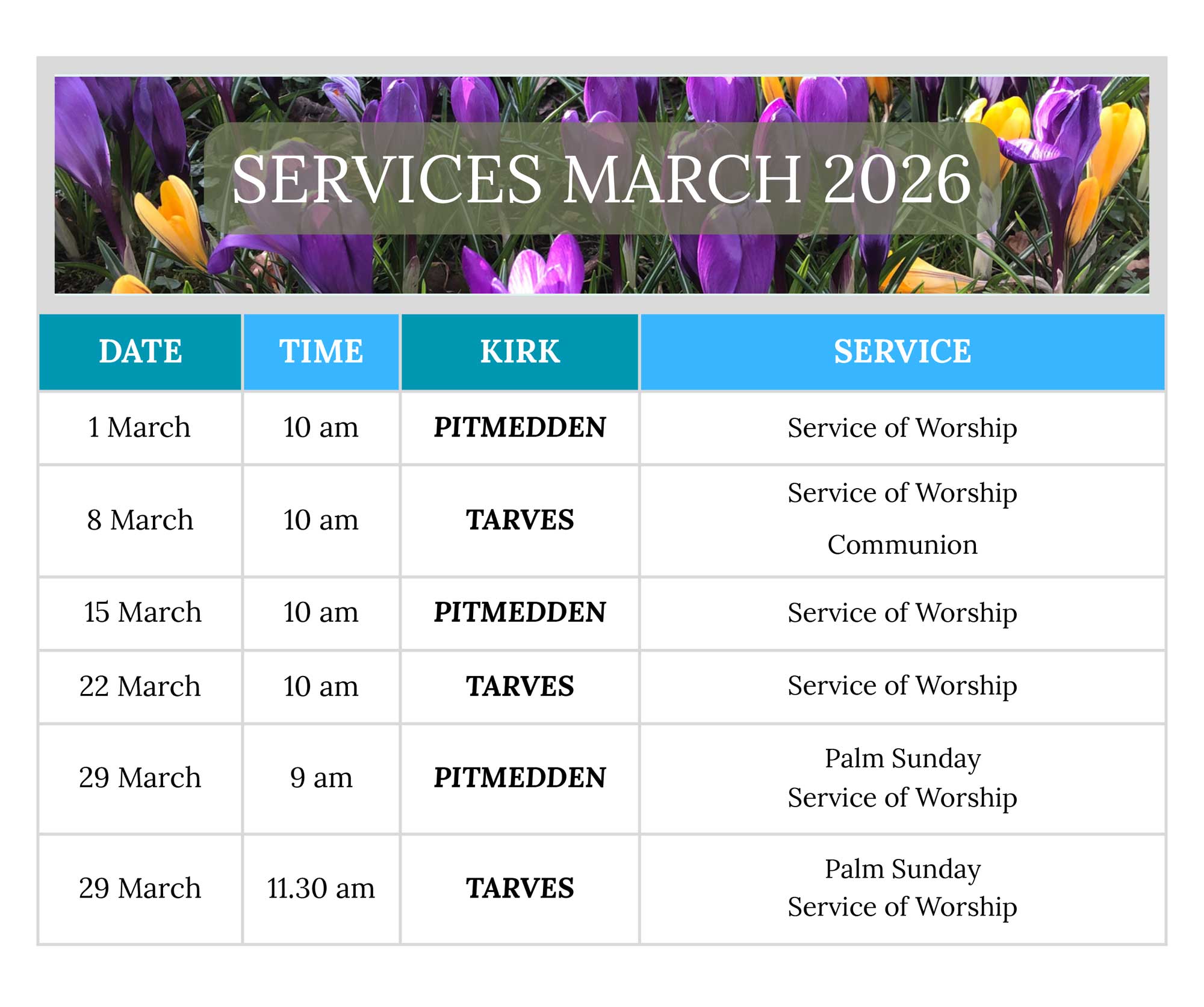 Services of worship are held on Sundays at 10.00 am alternating between Tarves and Pitmedden kirks. Check the calendar for details.